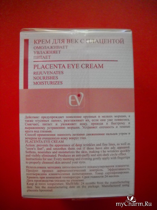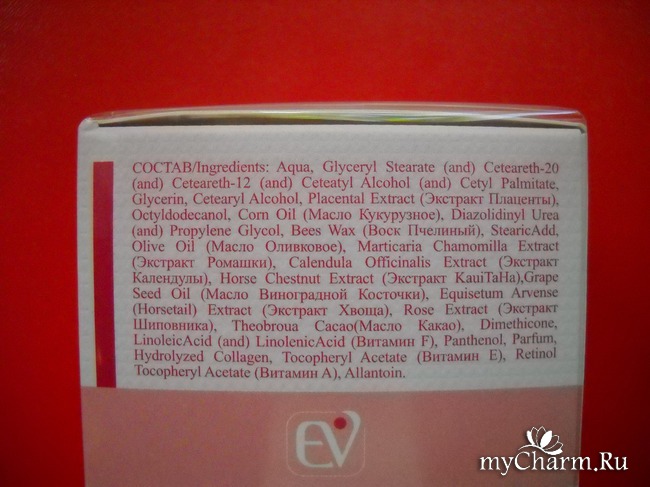Состав, конечно же, впечатляет! Экстракт плаценты, полученный с использованием методики липосомального инкапсулирования плаценты – это далеко не все полезности, которые содержатся в данном креме. В нем присутствуют ценные масла (кукурузное и оливковое масло, а также масла какао и виноградной косточки), пчелиный воск, а также комплекс витаминов (A, E и F) и полезнейших растительных экстрактов (каштана, календулы, шиповника, хвоща и ромашки). Такой крем просто обязан приносить пользу!