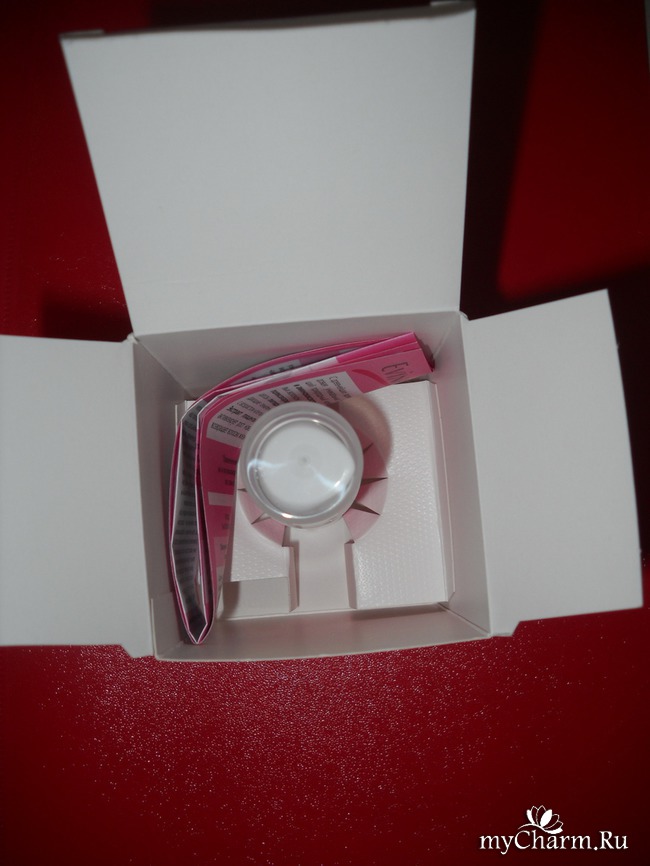 Флакончик с кремом надежно зафиксирован в коробочке с помощью прочного картонного каркаса.