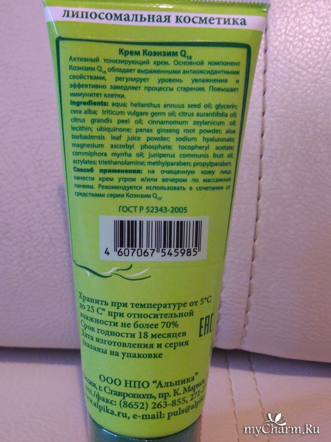 Крем «Коэнзим Q10» произведен в России, в городе Ставрополе. Отмечено, что средство изготовлено по ГОСТ. Из знаков сертификации на тюбике видим ЕАС. Срок годности крема – целых полтора года. Меня смутило то, что на тюбике не указано, сколько можно хранить этот крем после вскрытия. Производителю стоило бы это указать, по-моему. У меня самой кремы особо не задерживаются, конечно, но есть ведь люди, которые пользуются разными средствами.