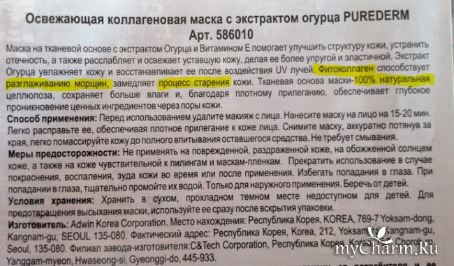 Полное название маски: Освежающая маска с экстрактом огурца Purederm.