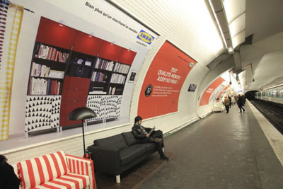 Потому что это – новый проект известной и любимой у нас мебельной компании IKEA. Такими «инсталляциями» фирма решила привлечь к себе внимание парижан. Конечно, вы скажете: «ну это же реклама!». Ну и что. Посидеть на мягком диване, назначить романтическую встречу «в центре зала на кресле в полосочку» или просто передохнуть от активного шопинга – никто не запрещает!