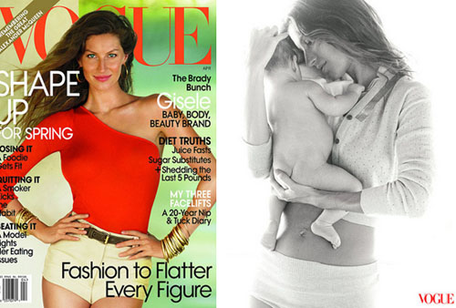 А вторая молодая мама, поразившая всех своей невероятной формой после родов, это, конечно, Жизель Бюндхен. Признаюсь, её обложка мне нравится больше всего в апреле. Безупречная фигура, отличные сочетания, яркость самой Жизель – одни комплименты! Для американского Vogue в апреле была выбрана стилистика 90-х, и этот образ Жизель отработала на все 100! К тому же, Жизель рискнула показать всем своего малыша Бенджамина, и это тоже не может не привлечь к фотосессии. Её секреты хорошей формы? Она, как и Хайди, поделилась ими с редакцией: основной секрет – держать форму в течение всей беременности. «Я ходила на кунг-фу даже за две недели до рождения Бенджамина, йогой занималась трижды в неделю. Я постоянно контролировала то, что я ем. А то, что я вернулась так быстро в форму – это заслуга постоянных тренировок до и во время беременности – какая-то мышечная память сработала».