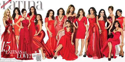 Следующая группа девушек в красном: певица Глория Эстефан, Мишель Родригес, актриса Джессика Альба, телеведущая и модель Дэйзи Фуэнтес, модель Америка Феррера