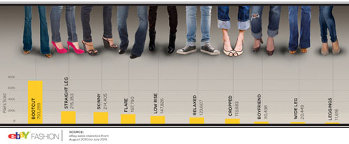 Но мы ошиблись. Современные девушки следят за модой и не боятся избавляться от стереотипов, пробуя новые модели. Вот и исследование Интернет-магазина eBay об этом свидетельствует. Самой продаваемой моделью сейчас являются – джинсы «bootcut». Для несведущих – это джинсы обязательно с очень длинными штанинами, закрывающими обувь, даже если это – высоченная шпилька. Эта модель лидирует с очень большим отрывом.