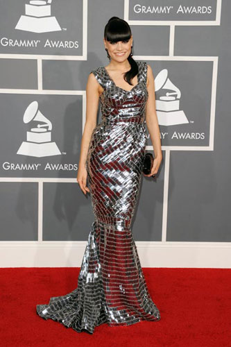 Наряд от Julien Macdonald. Критики говорят, что для выхода на сцену это был идеальный выбор. Отражающие свет детали роскошно подсветили Джейси. А прическа и макияж должны быть сдержанными, и так много бликов.