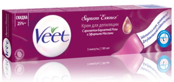 Крем Suprem’Essence объемом 180 мл обогащен натуральными эфирными маслами и дарит аромат Бархатной Розы, а крем Veet для чувствительной кожи (200 мл) с Алоэ Вера и Витамином Е обеспечивает особенно бережную и деликатную депиляцию.
