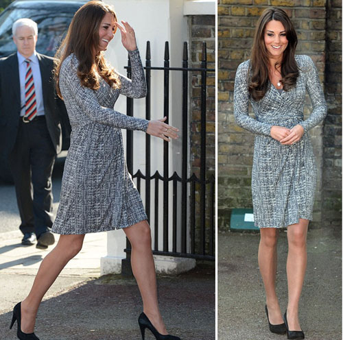 Кейт удалось найти модель платья, которое выгодно драпирует беременный животик и вместе с тем не является громоздким. Это платье от MaxMara, из коллекции 2011 года за 298 фунтов стерлингов. Удобное платье-пальто с запахом, длиной до середины колена. Обувь – туфли-лодочки от House Of Fraser за 60 фунтов.