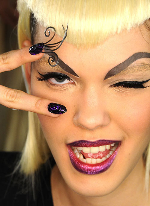 Макияж создавали визажисты MAC Cosmetics. Смелые оттенки этого бренда позволяют создать макияж любой сложности и яркости.