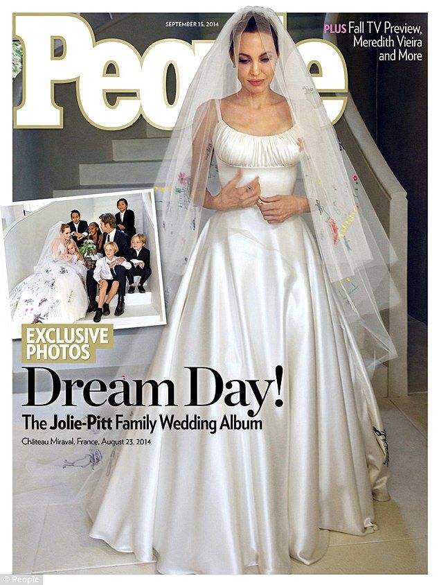 Анджелина Джоли пошла к алтарю в фате и сатиновом белом платье, украшенном рисунками ее детей. Автором платья стал модельер дома Versace Луиджи Масси (Luigi Massi). Сама 39-летняя невеста призналась, что Луиджи для нее - часть семьи, и она просто не представляла кого-то другого в качестве дизайнера ее свадебного платья.