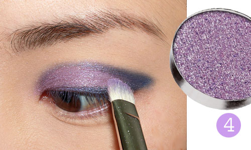 Шаг 4. Мерцающие сиреневые тени нанесите в центре верхнего века, этот блик обеспечит трехмерность, сделает цвет более ясным и чистым.