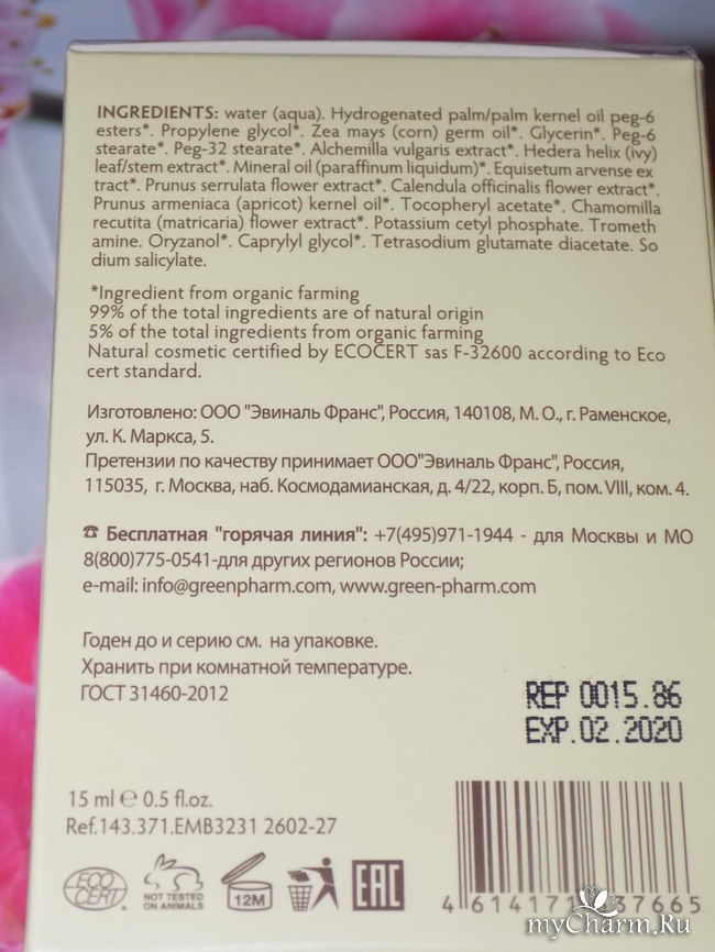 Основные ингредиенты этого крема: HYDROGENATED PALM/PALM KERNEL OIL ESTERS*. ZEA MAYS (CORN) GERM OIL*. ALCHEMILLA VULGARIS EXTRACT*. HEDERA HELIX (IVY) LEAF/STEM EXTRACT*. EQUISETUM ARVENSE EXTRACT*. PRUNUS SERRULATA FLOWER EXTRACT*. CALENDULA OFFICINALIS FLOWER EXTRACT*. PRUNUS ARMENIACA (APRICOT) KERNEL OIL*. CHAMOMILLA RECUTITA (MATRICARIA) FLOWER EXTRACT*.