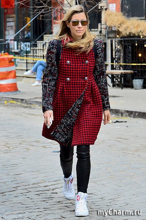 Папарацци сфотографировали актрису Джессику Билл в Нью-Йорке. И хотя сама Джесс выглядит сияющей, удачным ее наряд не назовешь.Пальто со вставками сделало руки Джессики массивными, как у рэгбиста. Верх и низ наряда смотрятся совершенно негармонично.