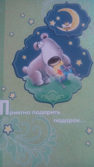Вот такой милый мишка очень красивые цветы. А внутри так хорошо написано поздравление, аж тронуло.
