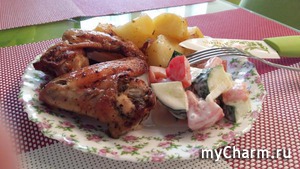 Куриные крылышки запеченные с картошкой, замаринованные с базиликом и бальзамическим уксусом.