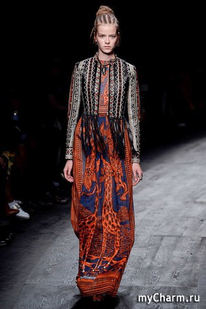 Весенне-летняя коллекция Valentino посвящена Африке. На удивительных платьях вышиты яркие африканские мотивы - как привет с совершенно другого мира. Не забыли дизайнеры и про бахрому, которая является символом нарядов африканцев.На платьях вышиты африканские орнаменты и животные (жирафы, леопарды, к примеру), что добавляет им оттенок нетронутой природы жаркого материка.