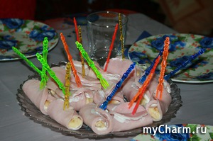 Ветчину нарезаю тонкими ломтиками, смазываю соусом (сметана+хрен, можно свежий корень потереть, можно готовый в магазине купить), заворачиваю небольшой ломтик банана, фиксирую шпажкой.