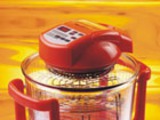 Аэрогриль состоит из стеклянной круглой колбы и крышки, оснащенной встроенным нагревательным элементом и вентилятором. В то время как нагревательный элемент нагревает воздух до требуемой температуры, вентилятор равномерно «обдувает» продукты, которые помещаются на решетки внутри колбы. Аэрогриль хорош не только тем, что в нем можно регулировать температуру в пределах 60-260 градусов, вам под силу устанавливать скорость воздушных потоков, чтобы не пересушить продукты.