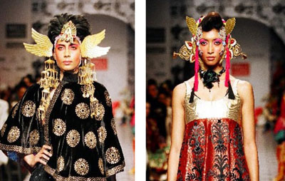 Или же другой вариант в виде крыльев. Дань моде на шляпки с ушами, Shilpa Chavan выразила именно так. Добавив ярких индийских красок, золота и символики в виде перьев. Правда, редкая модница рискнет появиться в чем-то подобном на российских улочках.