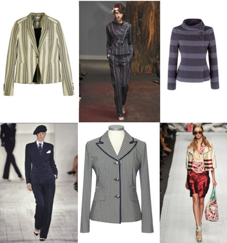 • И, конечно же, костюмы и жакеты. Весной 2010 года, нам, женщинам, многие дизайнеры посоветовали надеть мужские костюмы или хотя бы те, которые стилизованы под них. В частности, костюмы в тонкую полоску. В этом аспекте очень интересны модели Ральфа Лорена. Смотрятся весьма сексуально. Не нравится такой вариант? Тогда женственные жакеты точно порадуют вас своим многообразием цветов и фасонов.