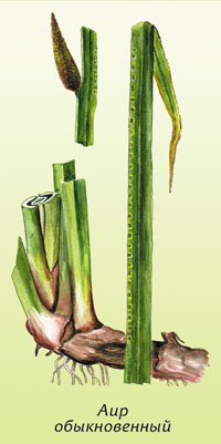В медицинских и косметических целях используются корни аира, которые содержат: витамин С, крахмал, горький гликозид акорин и эфирное масло.