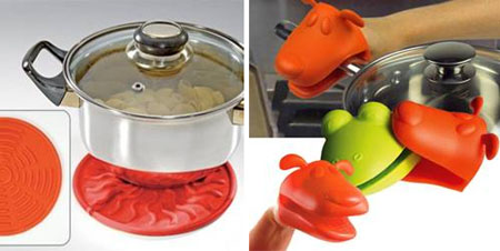 Силиконовые подставки также можно использовать в качестве прихваток, а поглотители шума представляют собой специальные колпачки на ножки вибрирующих бытовых приборов. Такие силиконовые насадки также сберегут ваше напольное покрытие от механических повреждений.