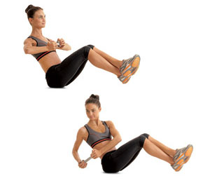Упражнение 1. Сядьте на пол, колени согните, в руки возьмите гантель. Согните локти, гантель должна оказаться точно напротив груди. Оторвите стопы от пола, скрестите лодыжки и отклонитесь назад на 45 градусов. Поверните корпус вправо и опустите гантель вниз, не касайтесь пола. Затем вернитесь в исходное положение и повторите в другую сторону. Это будет раз. Количество повторов зависит от того, с каким весом вы работаете. Данное упражнение хорошо развивает выносливость, учит контролировать свое тело.