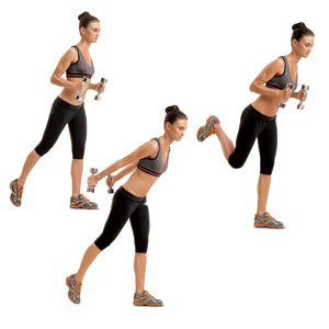 Упражнение 2. Встаньте прямо, возьмите в руки гантели, поднимите назад правую ногу, не отрывая пальцы ног от пола. Согните локти под углом 90 градусов, при этом руки параллельны туловищу. Наклоните корпус слегка вперед, а руки выпрямите назад. Одновременно с этим согните правую ногу в колене. Затем вернитесь в исходное положение. Сделайте сначала половину повторов для одной ноги, потом для другой, и снова повторите.