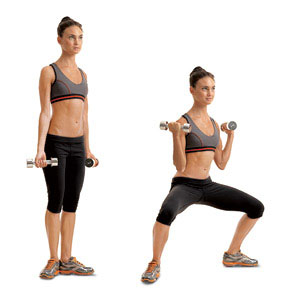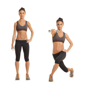 Упражнение 3. Встаньте прямо, ноги расставьте на ширину плеч, в правую руку возьмите гантель, а левую руку поставьте на бедро. Сделайте глубокий шаг правой ногой в левую сторону, ноги как будто стоят крест-накрест. Сгибайте правое колено до тех пор, пока ваше левое бедро не будет параллельно полу. Одновременно со сгибанием коленей поднимите правую руку перед собой до уровня плеча. Затем вернитесь в исходное положение. Упражнение хорошо тем, что задействуются мышцы, которые редко участвуют в упражнениях.