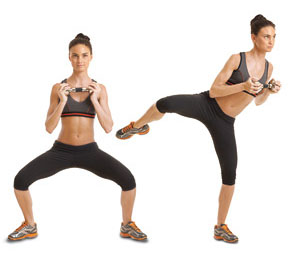 Упражнение 4. Ноги широко расставьте. В руки возьмите гантель. И поднимите ее до уровня груди. На вдохе, оторвите правую ногу от пола и поднимите ее до уровня бедра, корпус наклоните влево. Затем опустите правую ногу и глубоко присядьте, не отрывая стоп от пола. Это раз. В общем, упражнение напоминает действия борцов сумо.