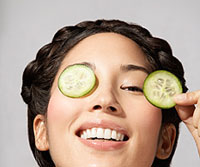 - Маска из огурцов: такая маска подойдет для любого типа кожи. Нанесите кожуру свежих огурцов на очищенное лицо. Для того чтобы кожура не отпадала, на нее сверху прикладывают марлевую тряпочку. Используется такая маска в течение 20 минут. После снятия маски лицо не промывают.