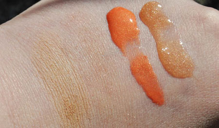 Слева – пробы двух оттенков бронзирующей пудры. Текстура приятная, мягкая, кремовая. Справа – роскошные блески: сверкающие, мягкие по прикосновению, стойкие.