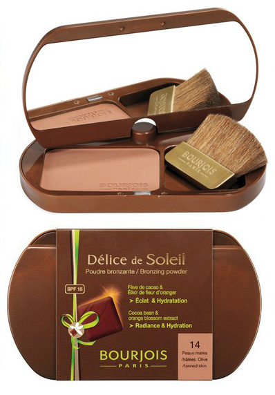 • Delice de Soleil (Sun Delight) Bronzing Powder. Элегантный и красивый продукт для вашей косметичке. Это такой компакт в удобной упаковке с кистью. Зеркало поворачивается на 360 градусов, и продукт превращается просто в удобное большое зеркало для сумочки. Представлено 2 оттенка: