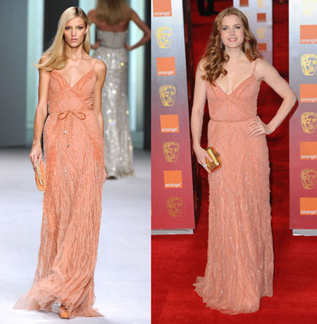 Другая американская актриса Эми Адамс отдала своё предпочтение длинному платью на тонких бретельках. Платье нежного лососевого оттенка (так этот оттенок характеризует сам дизайнер) декорировано лентами и пайетками. В этом наряде Эми Адамс появилась на ежегодном вручении премии Британской академии кино и телевидения в Лондоне.