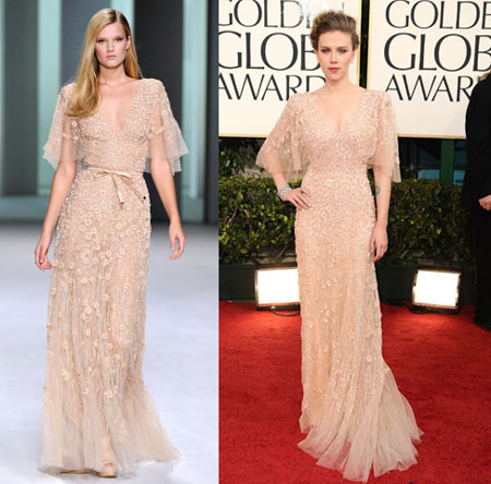 На церемонию вручения кинопремии «Золотой глобус» актриса Скарлетт Йоханссон выбрала длинное платье из полупрозрачного тюля, вышитое пайетками и цветами. Платье телесного цвета с рукавом летучая мышь и V-образным вырезом очень идёт актрисе. Ещё один пример эффекта обнажённости в действии.