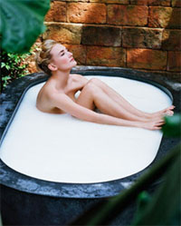 Благодаря наличию особых веществ (эмульгаторов), растворенное в теплой воде молоко способно проникнуть в глубокие слои кожи, насытить ее полезными элементами, которые входят в его состав, и придать ей нежный бархатисто-белый оттенок. Правда, по древним поверьям, раньше для купания использовалось молоко ослиц, однако в наше время его можно заменить козьим или коровьим. А оптимальная концентрация молока, согласно современным исследованиям, составляет 1-2 л на ванну воды. Такая процедура прекрасно подходит для обладательниц сухой и чувствительной кожи. К тому же, при регулярном применении она оказывает омолаживающее воздействие. А усилить чудодейственный эффект помогут 3-4 ст. л. меда (разбавленные предварительно в молоке).