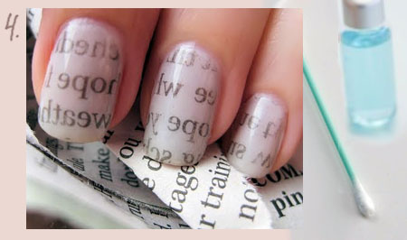 Шаг 4. После того, как на ногтевой пластине отпечатается газетный текст, возможно, «рисунок» будет немного выходить за пределы ногтя. Тогда возьмите ватные палочки и удалите неаккуратные места, воспользовавшись жидкостью для снятия лака.