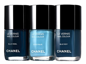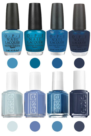 Джинсовые оттенки лаков есть у Chanel, Dior, недавно появилась деним-коллекция у Revlon, оттенки navy (военно-морского флота) традиционно удаются OPI и Essie, есть также целая палитра серо-синих цветов, оттенков ледяной воды, фиолетово-синих у большинство брендов, предлагающих лаки для ногтей.
