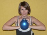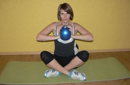 Сели в позу лотоса. Будем делать красивую упругую грудь. Руки перед собой, мяч между ладонями. С силой сжимаем мяч, задержались в таком положении. Расслабились. Следите, чтобы руки и плечи были на одной линии. Легко быть не должно.