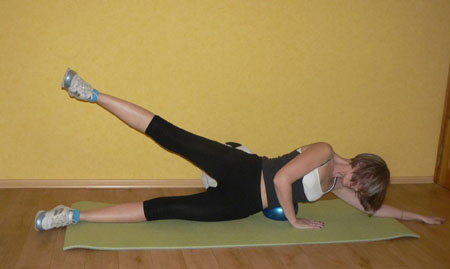 Ложимся на бок в прямую линию, верхней рукой упор ладонью в пол возле груди, мяч под поясницей. Поднимаем медленно ногу вверх, опускаем вниз. После 20 раз оставляем ногу наверху и медленно рисуем ею круги сначала в одну сторону, затем в другую.