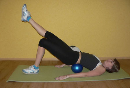 Эффективное упражнение для тренировки ягодичных мышц – подъем в полумост. Ложимся на пол, мяч под талией, руки вдоль туловища, плечи вжаты в пол, колени согнуты, стопы на полу. Поднимаемся в полумост, напрягаем ягодицы, одновременно выпрямляем одну ногу в одну линию с туловищем – выдох. На вдохе возвращаемся в исходное положение.