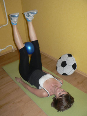 Работают внутренние мышцы бедра. Ложимся спиной на пол. Обе ноги перпендикулярно полу, мяч зажат между коленями. С силой сжимаем мяч, задержались в таком положении, расслабили ноги. После 20 раз это же упражнение выполняем в два раза быстрее.
