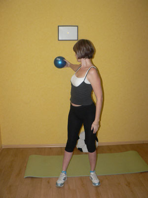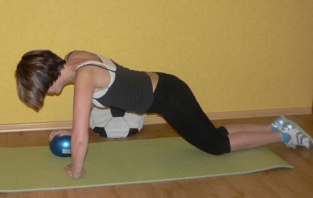 Отжимания с мячом. Стоим на коленях. Упор одной рукой в пол – ее ладонь развернута вовнутрь, вторая руки на мяче – ее ладонь смотрит прямо. Медленно отжимаемся. Затем опускаемся на пятки, потянулись вперед, расслабились.