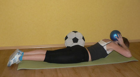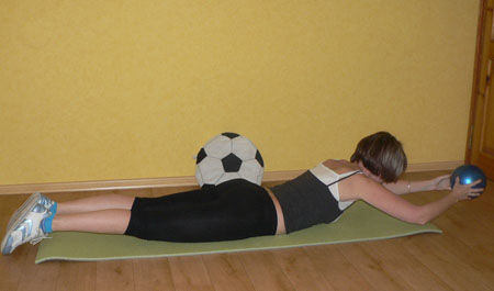 Опускаемся на пол, ложимся на живот, вытягиваемся в одну прямую линию. Мяч между ладонями.