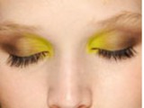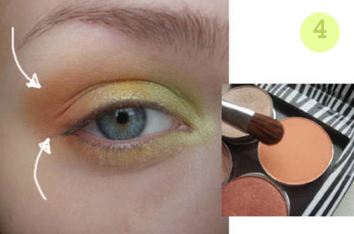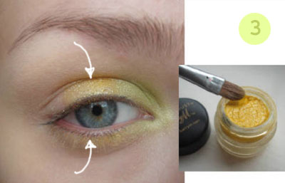 Шаг 3. Той же кистью кладем желтые тени, на центральную часть верхнего века и нижнего века. На верхнем веке делаем это легкими похлопывающими движениями, чтобы цвета лучше перемешались в месте перекрытия, а также растушевывались. Избегайте четких контуров теней.