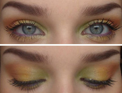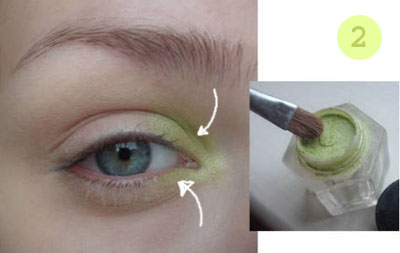 Шаг 2. Берем цитрусовый зеленый оттенок и плоской кисточкой наносим ближе к внутренним уголкам глаз. На верхнее и на нижнее веко.