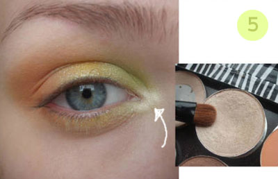 Шаг 5. Лучше всего всегда высветляйте внутренний уголок глаза, независимо от того, какой стиль макияжа вы выбираете. Маленькой кисточкой нанесите светло-бежевые (можно чуть мерцающие или перламутровые) тени.