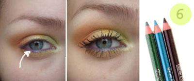 Шаг 6. Пока глаза немного бледные. Нужен лайнер. Попробуйте поиграть цветом. Черным можно подвести линию роста ресниц, а внутреннюю линию ресниц подчеркнуть более ярким лайнером. Здесь выбран фиолетовый карандаш-глиттер (карандаш с блестками), но вы можете воспользоваться коричневым, темно-синим, изумрудным.