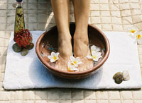 Спа-терапия для ног. Займемся ножками. Сделаем заживляющий пилинг, увлажним кожу стоп. Купите пакетик минеральной соли (бывают с ароматом лаванды, можно так называемую английскую соль, или сульфат магния) и пузырек с эфирным маслом лаванды. Налейте в тазик теплую воду, добавьте минеральную соль. Поместите ноги в тазик, расслабьтесь на несколько минут, можно полистать любимый журнал, послушать музыку, или просто закройте глаза и помедитируйте.Затем сделаем скраб. В полстакана сахара добавить несколько капель лавандового масла, этим составом помассируйте ноги. Вымойте и примените увлажняющий лосьон. Такая простая, а почти курортная процедура!