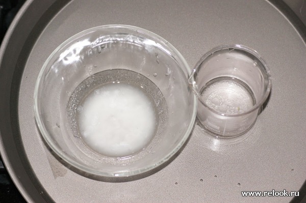 Сначала в нашу воду добавляем Биолин, он быстро там растворяется. Затем, берём две огнеупорные стеклянные ёмкости, в одну наливаем наши жирные масла из Фазы А и высыпаем эмульгатор, в другую - выливаем нашу воду с Биолином. Ставим их обеих греться на водяной бане до того момента, когда крупиночки эмульгатора расплавятся в маслах.