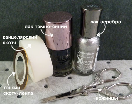 Для этого дизайна потребуется: два цвета лака (лучше контрастных оттенков, например, как у нас: цвет ночного неба + серебро), канцелярский скотч, тонкий скотч-лента для нейл-дизайна толщиной 1 мм (можно сделать из обычного скотча), ножницы.